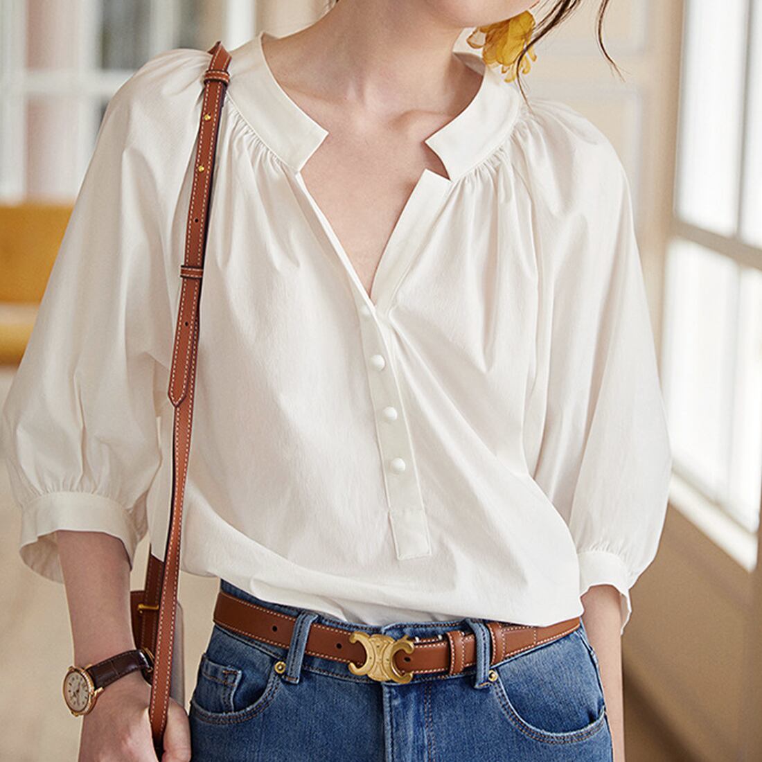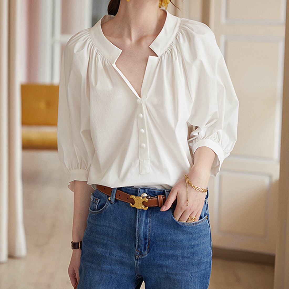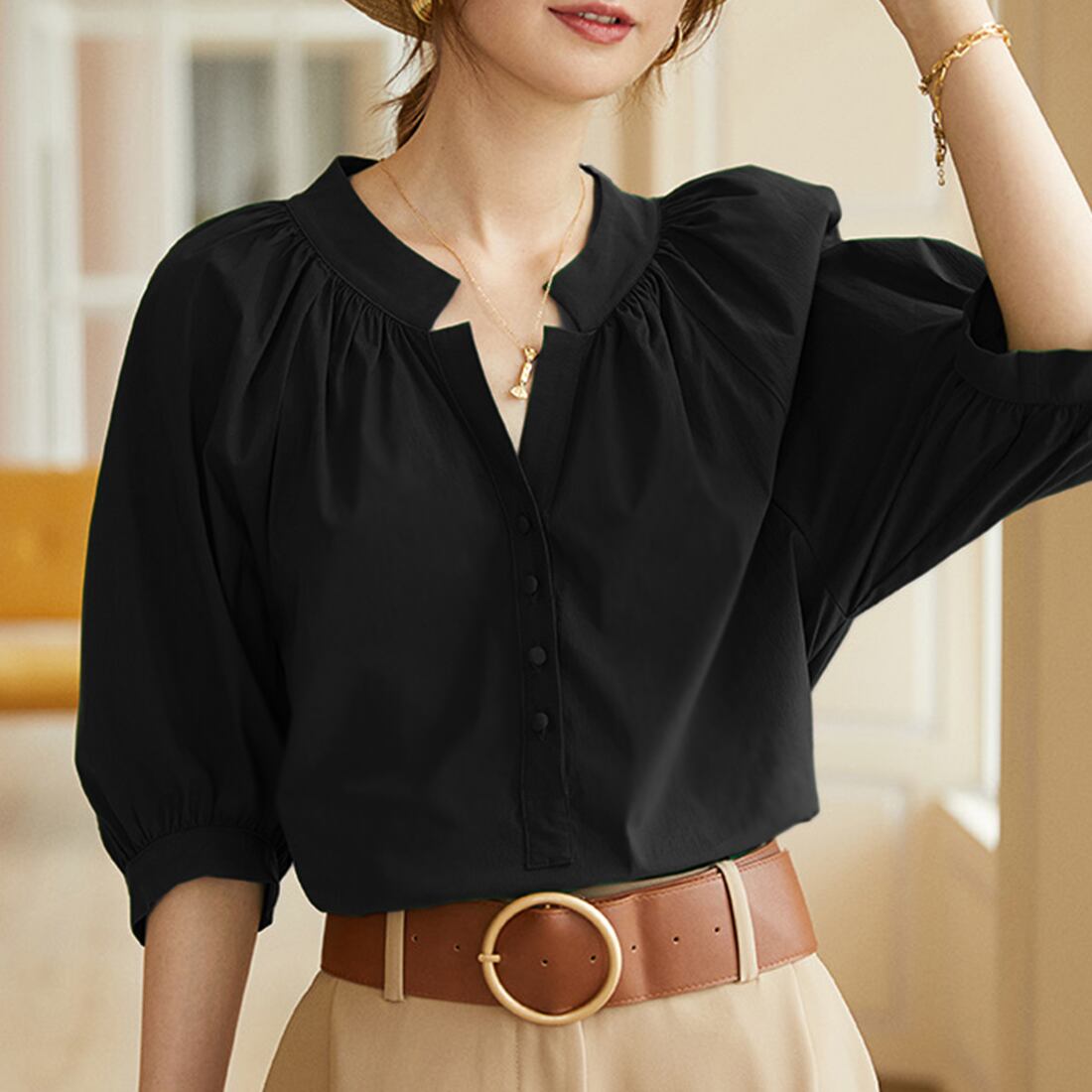 襟元のタックとVネックがデコルテを綺麗に見せてくれるブラウスが登場。