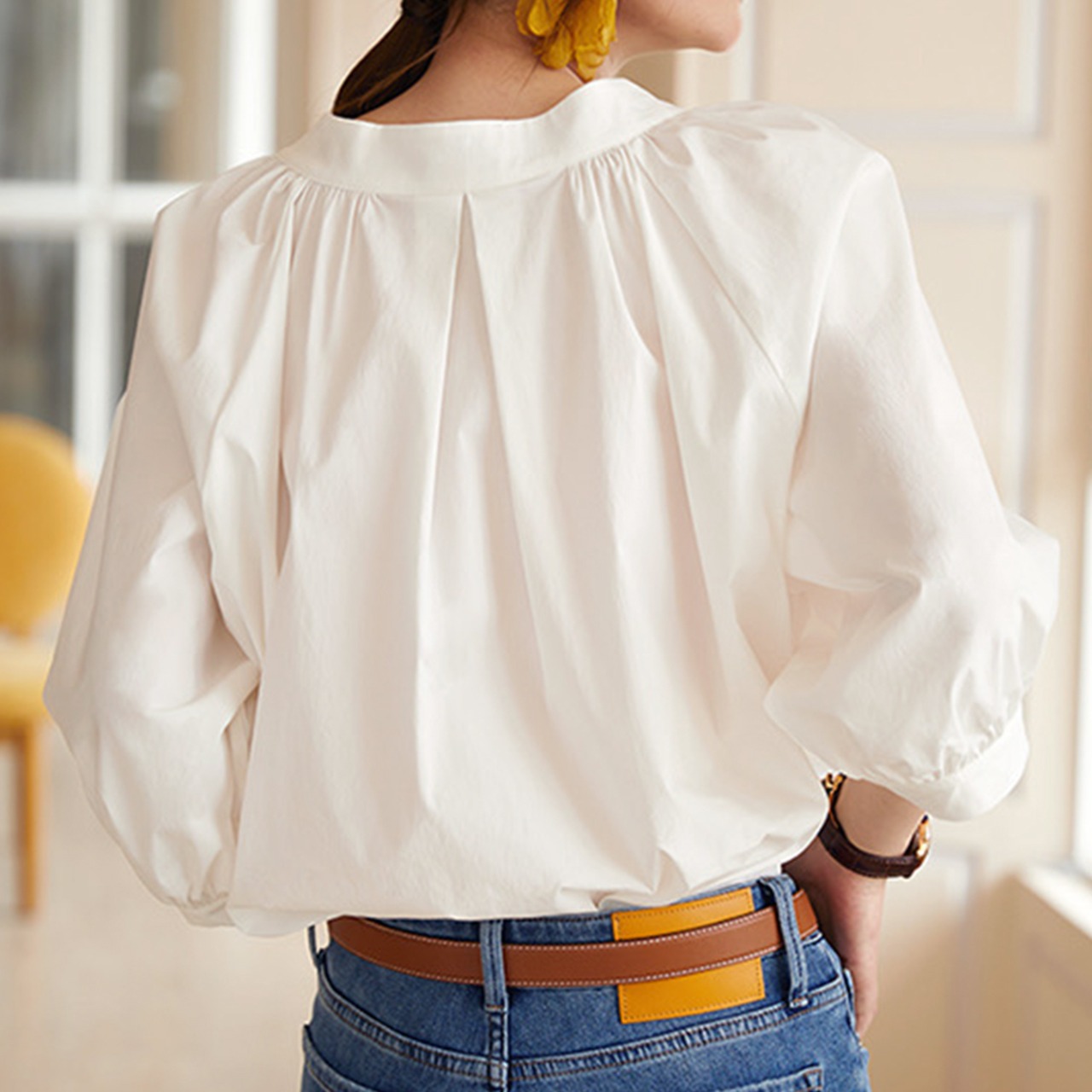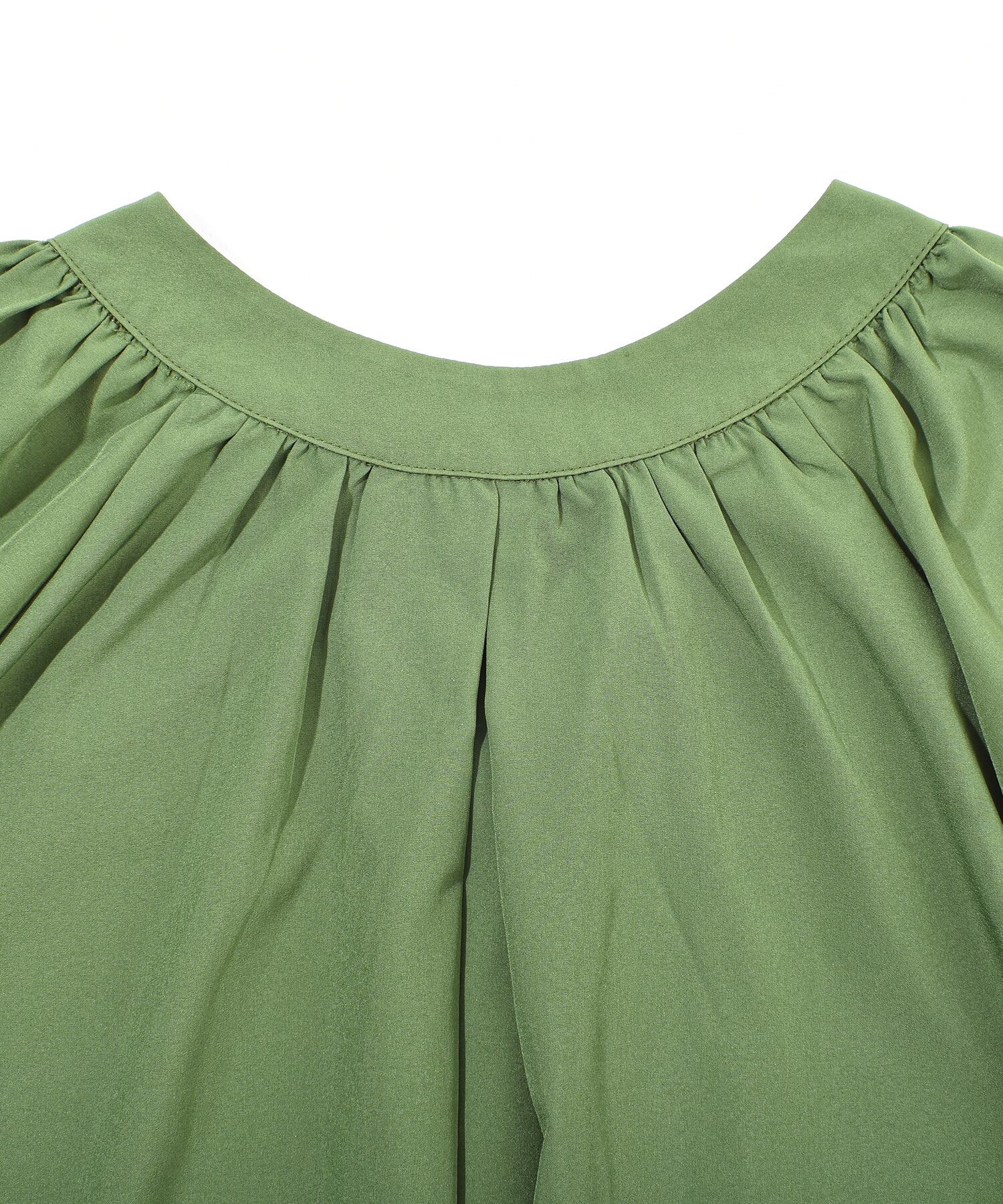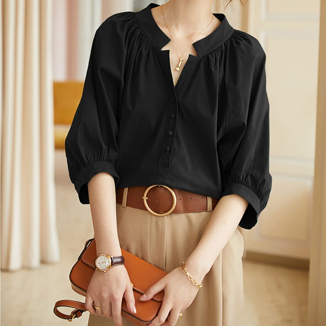 襟元のタックとVネックがデコルテを綺麗に見せてくれるブラウスが登場。