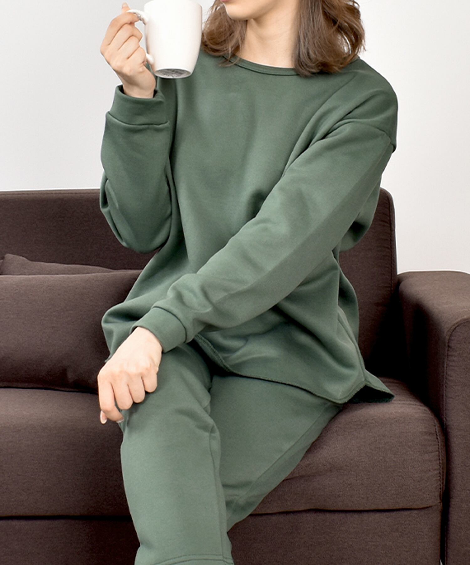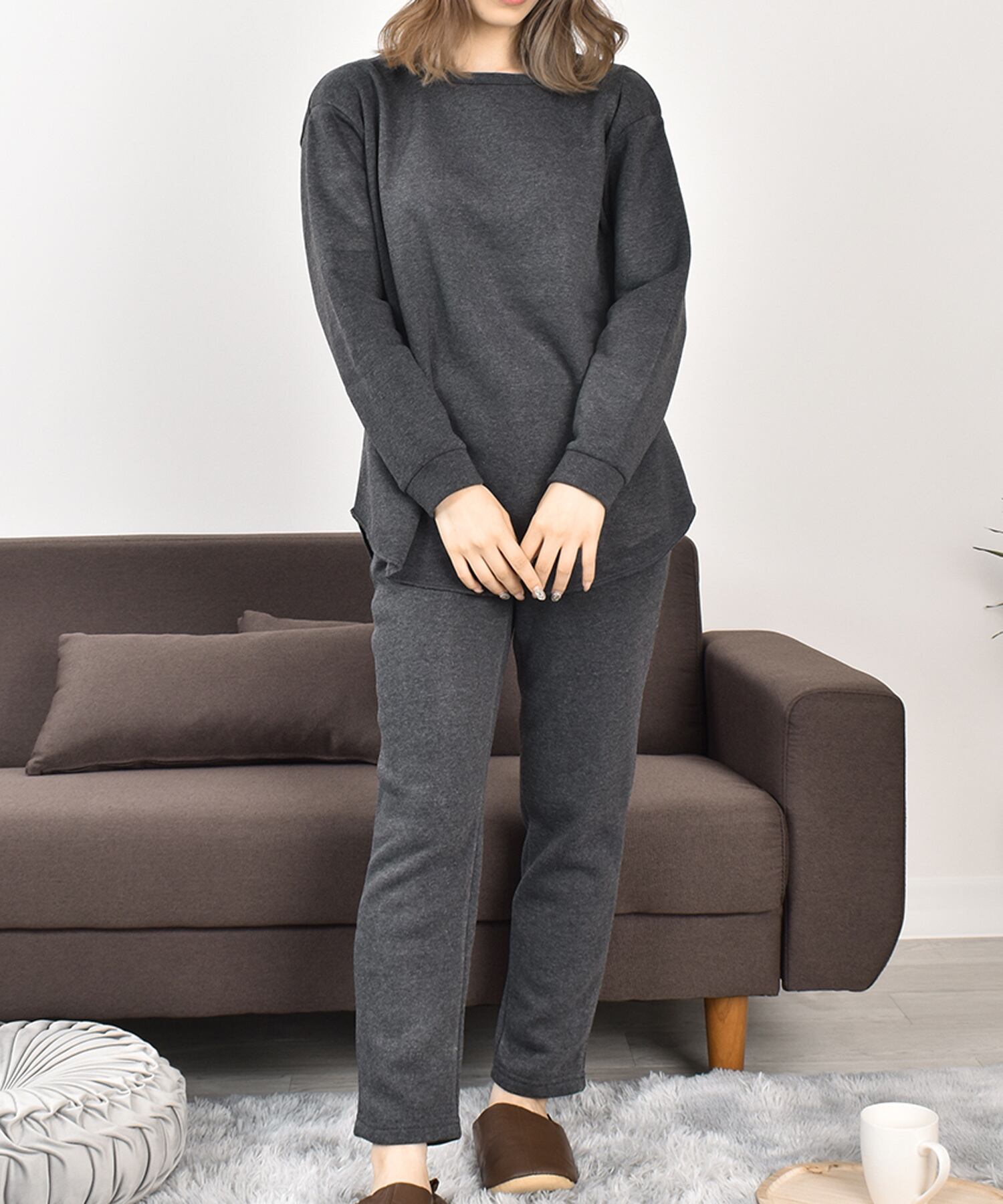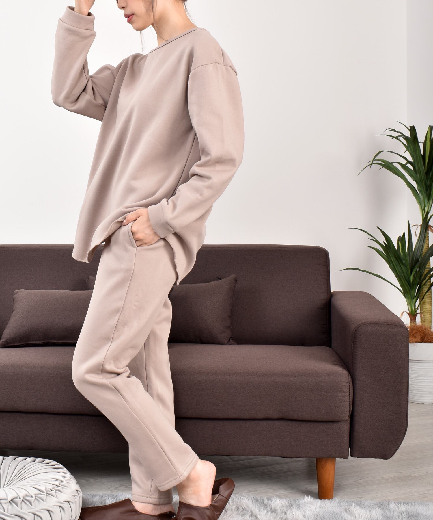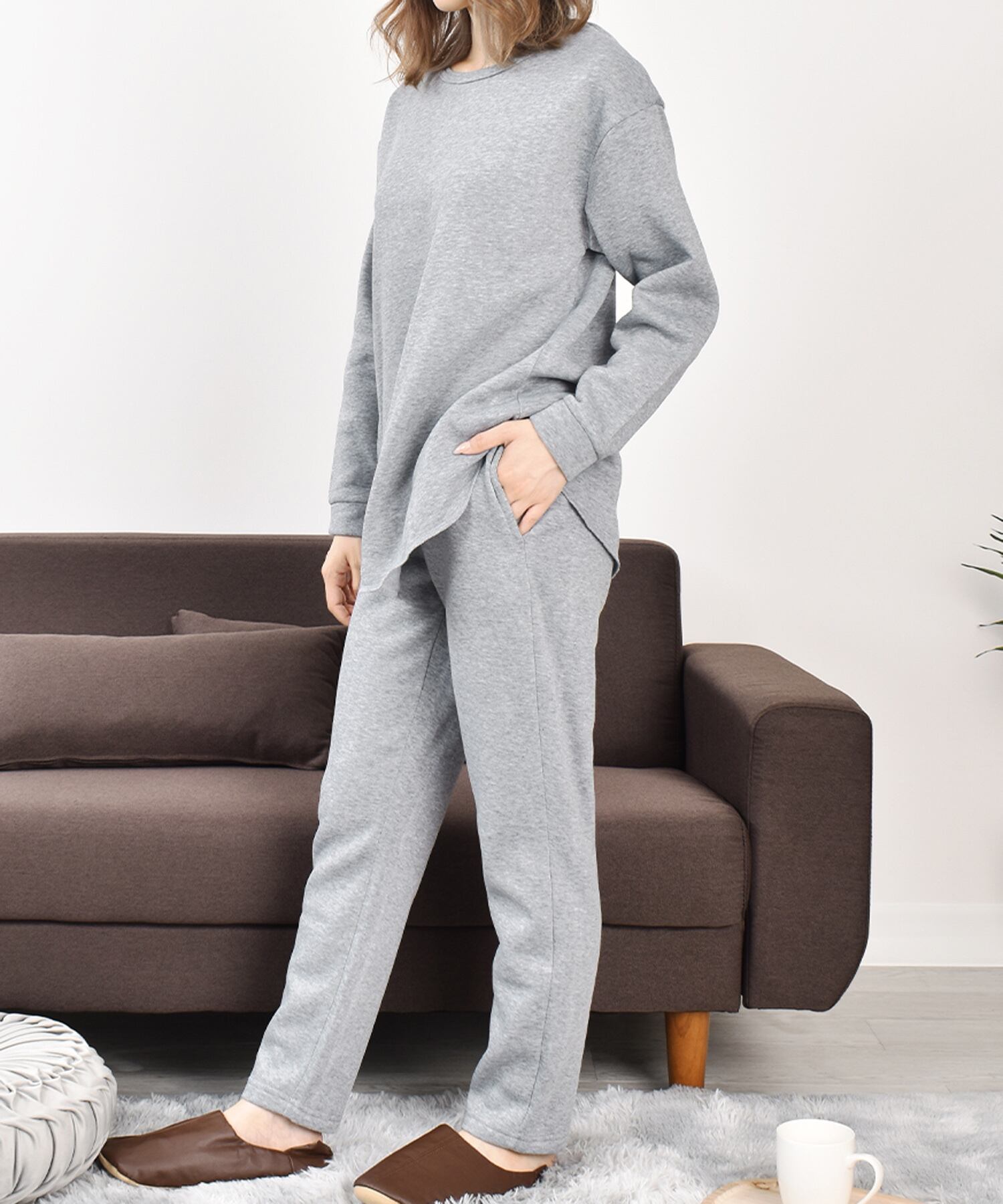 裏起毛ラウンドネックトップステーパードパンツ上下セットルームウェア(h210)