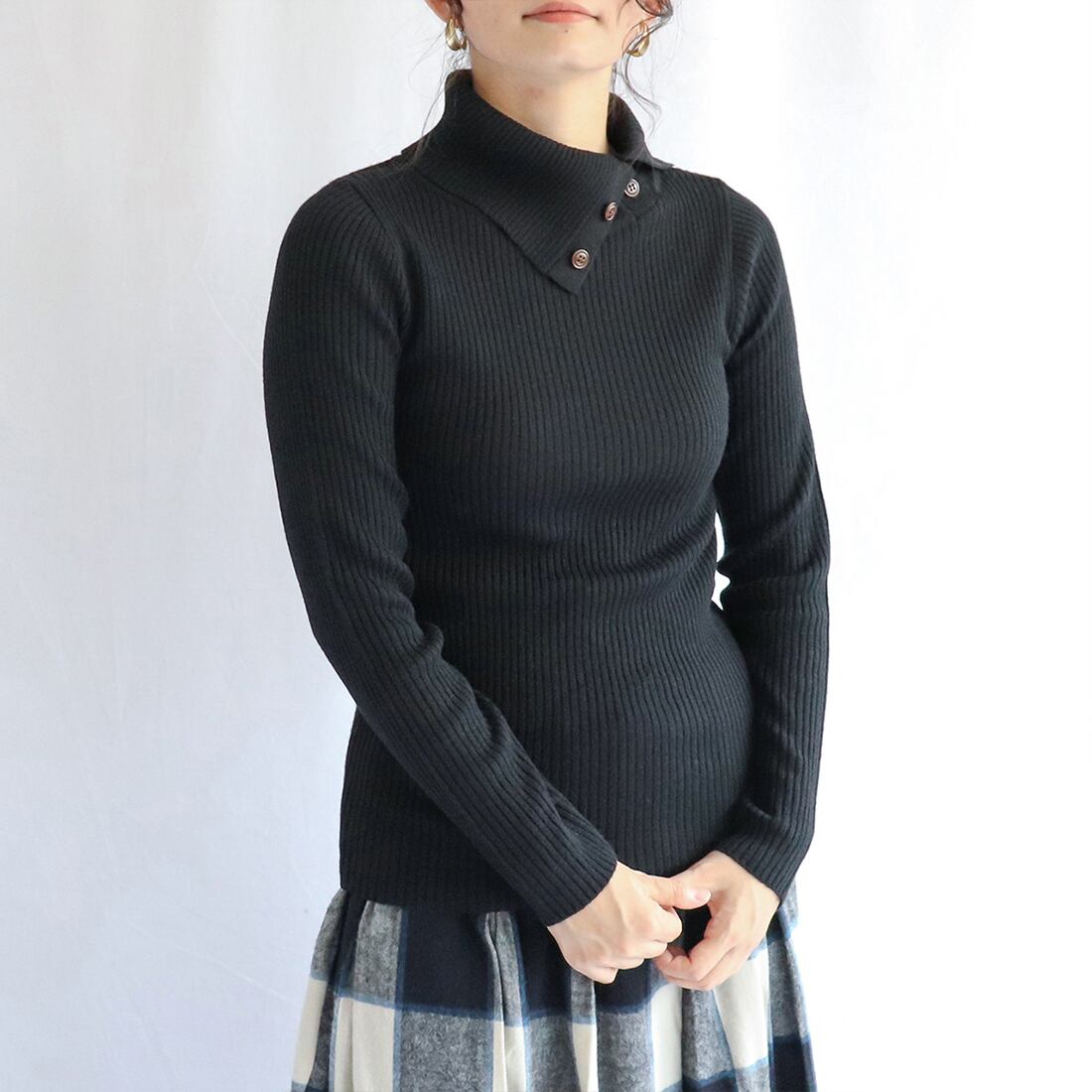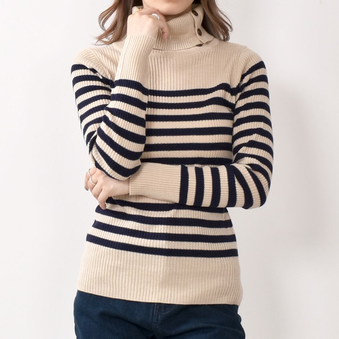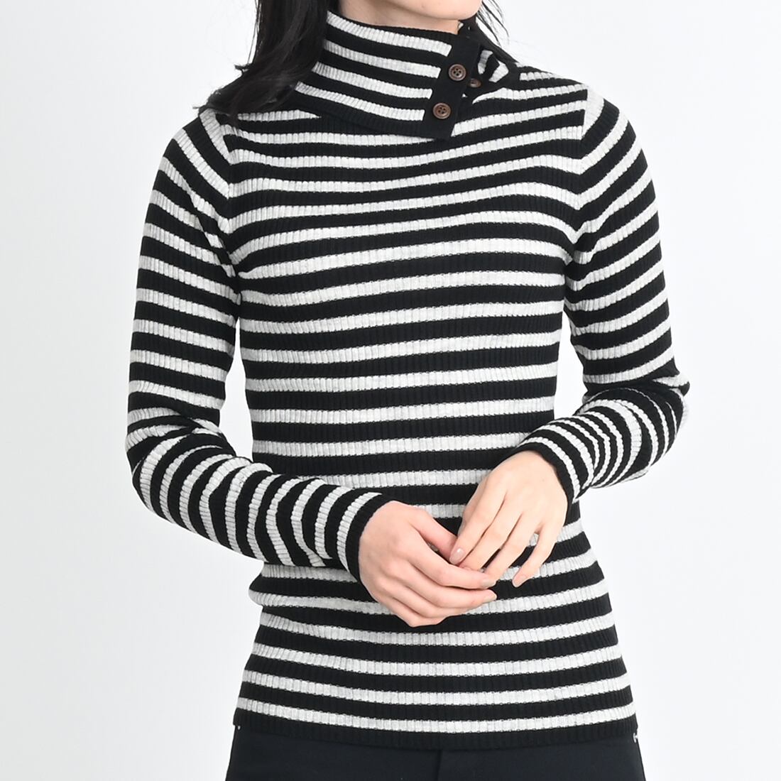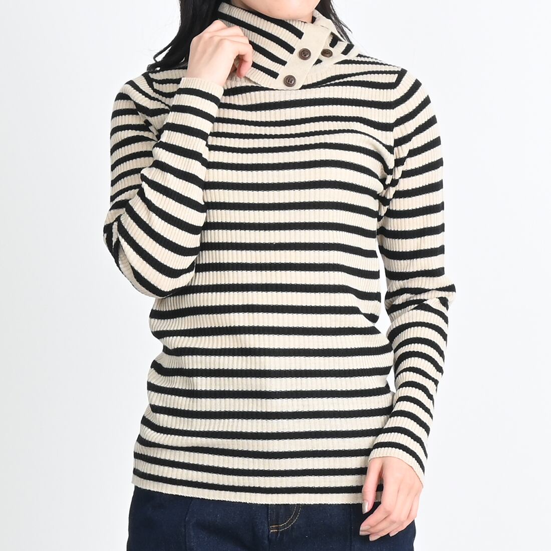 タートルネックにボタンが付いており、お好みの首元に調整できます。