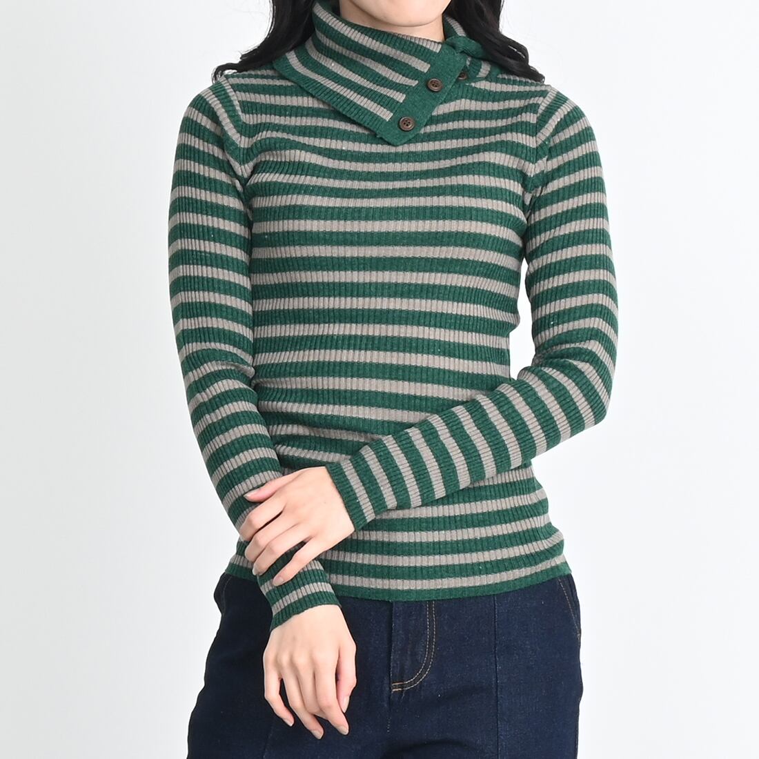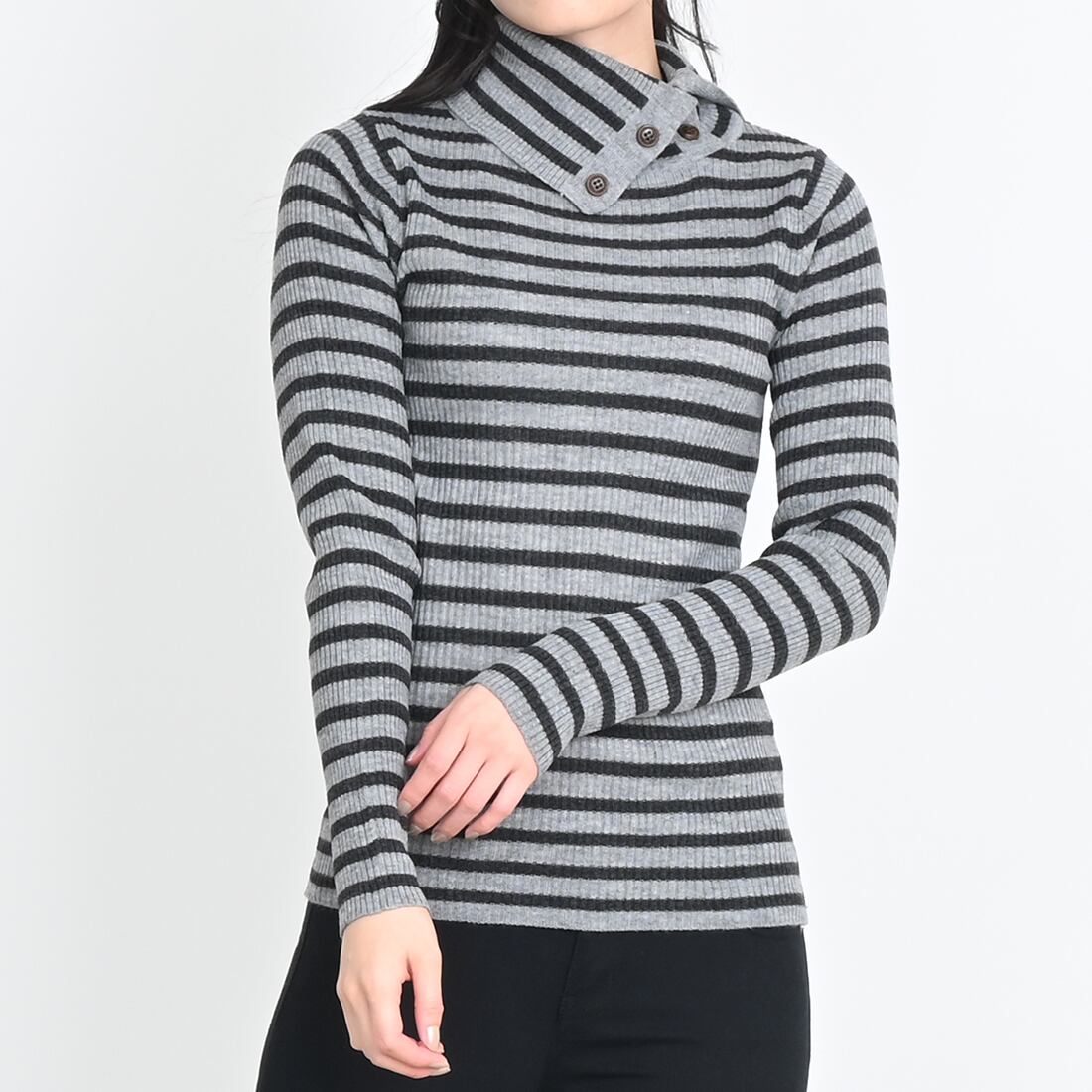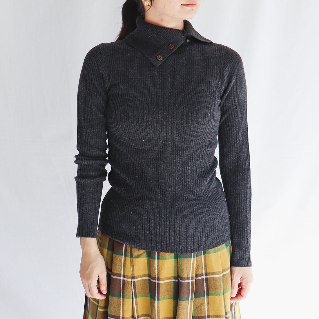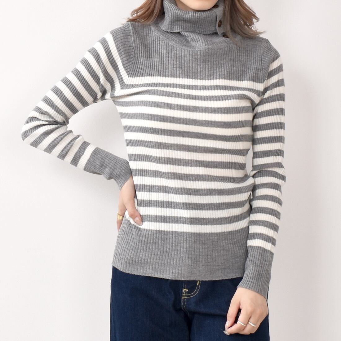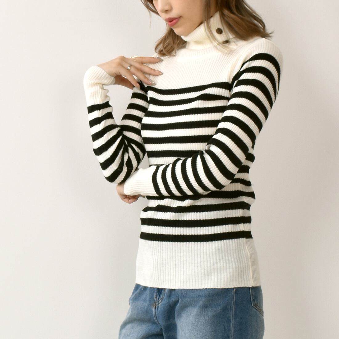 タートルネックにボタンが付いており、お好みの首元に調整できます。