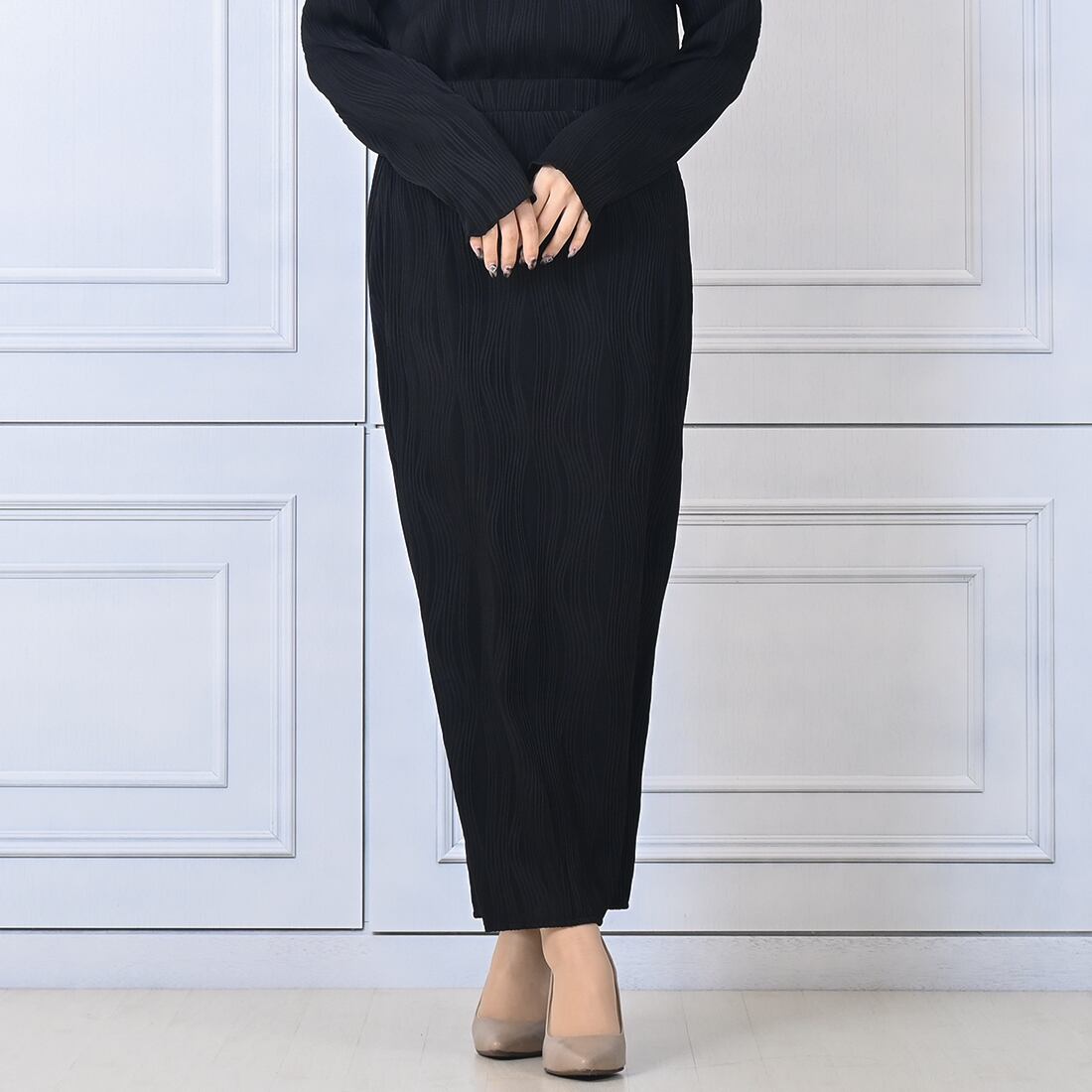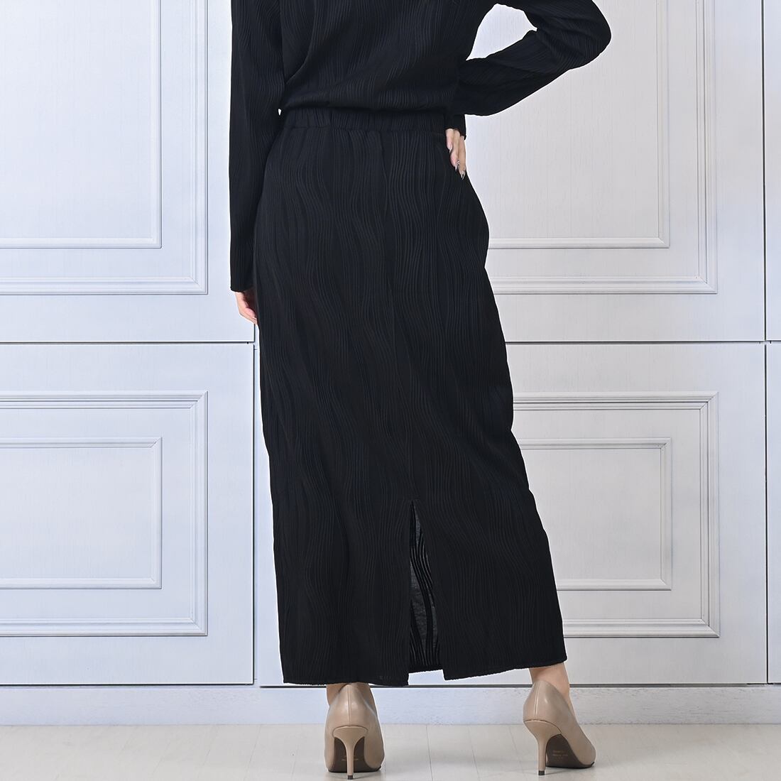 立体感のあるプリーツデザインがお洒落なロングスカートです。