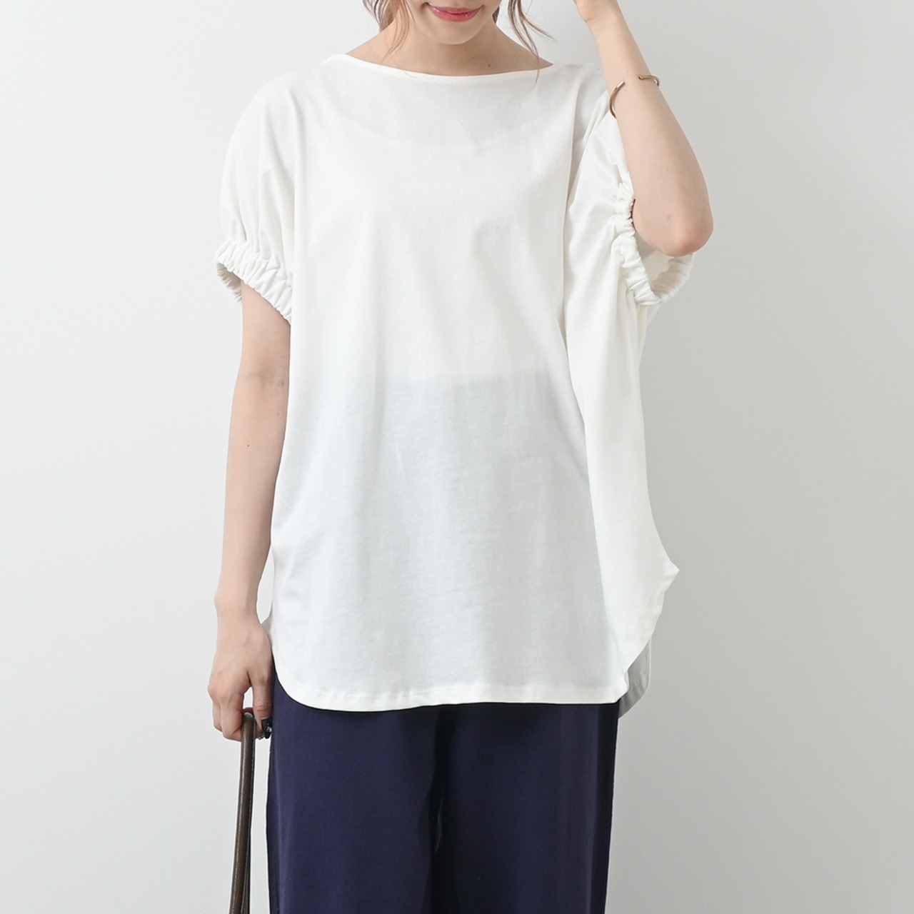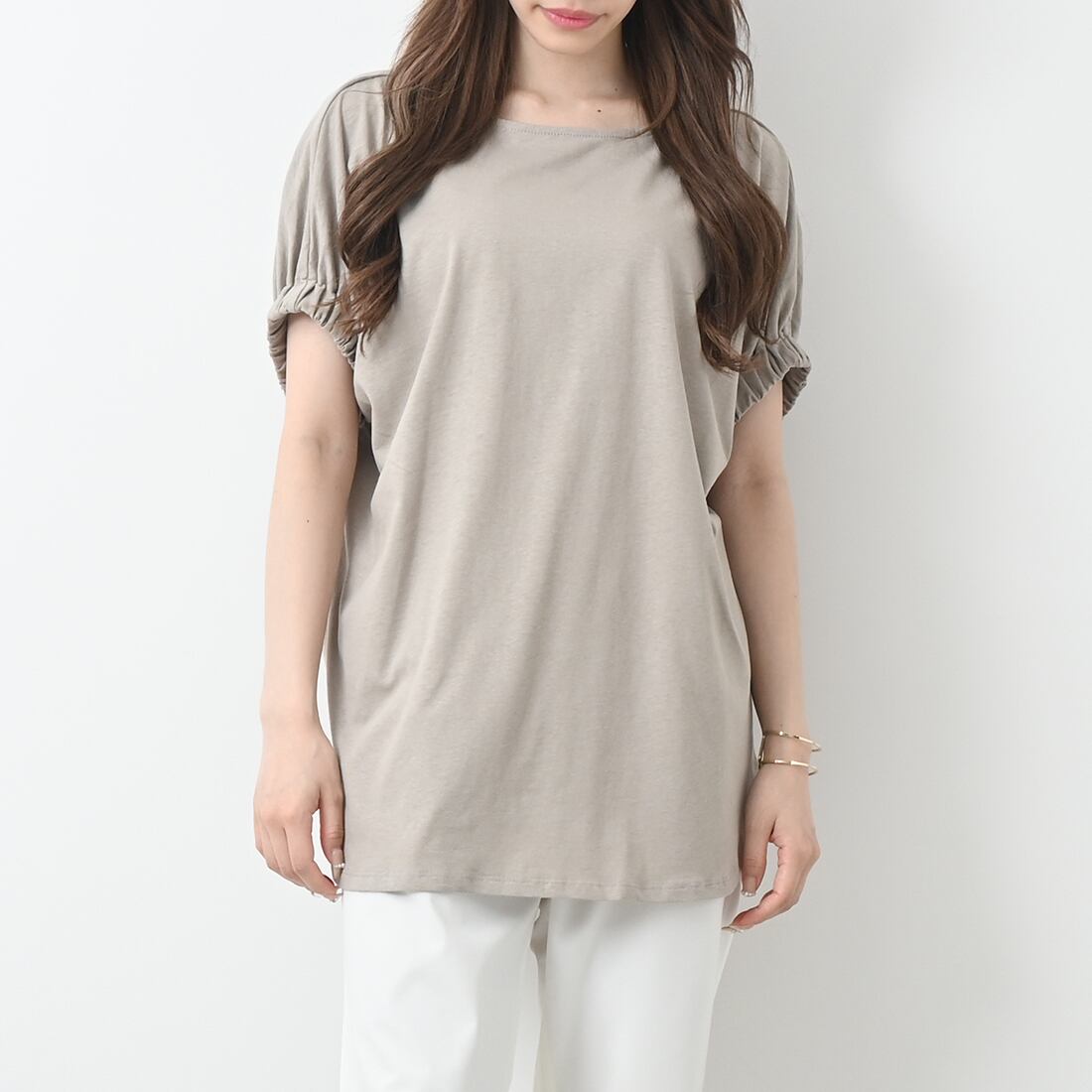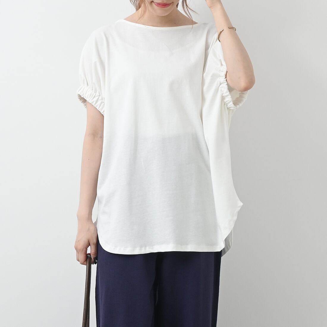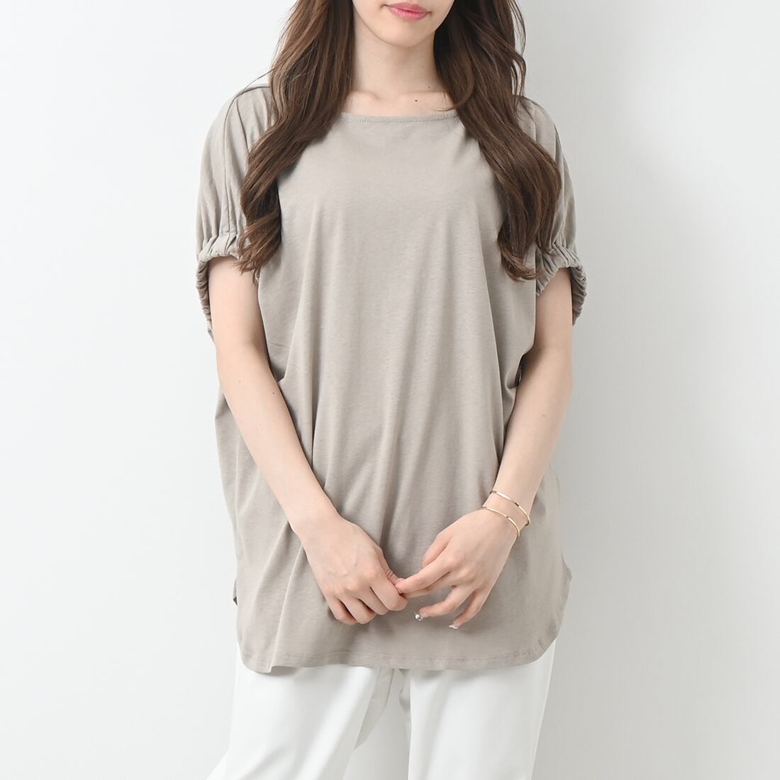 袖はゴムギャザーがアクセントになっていて、1枚でもサマになるデザイン。