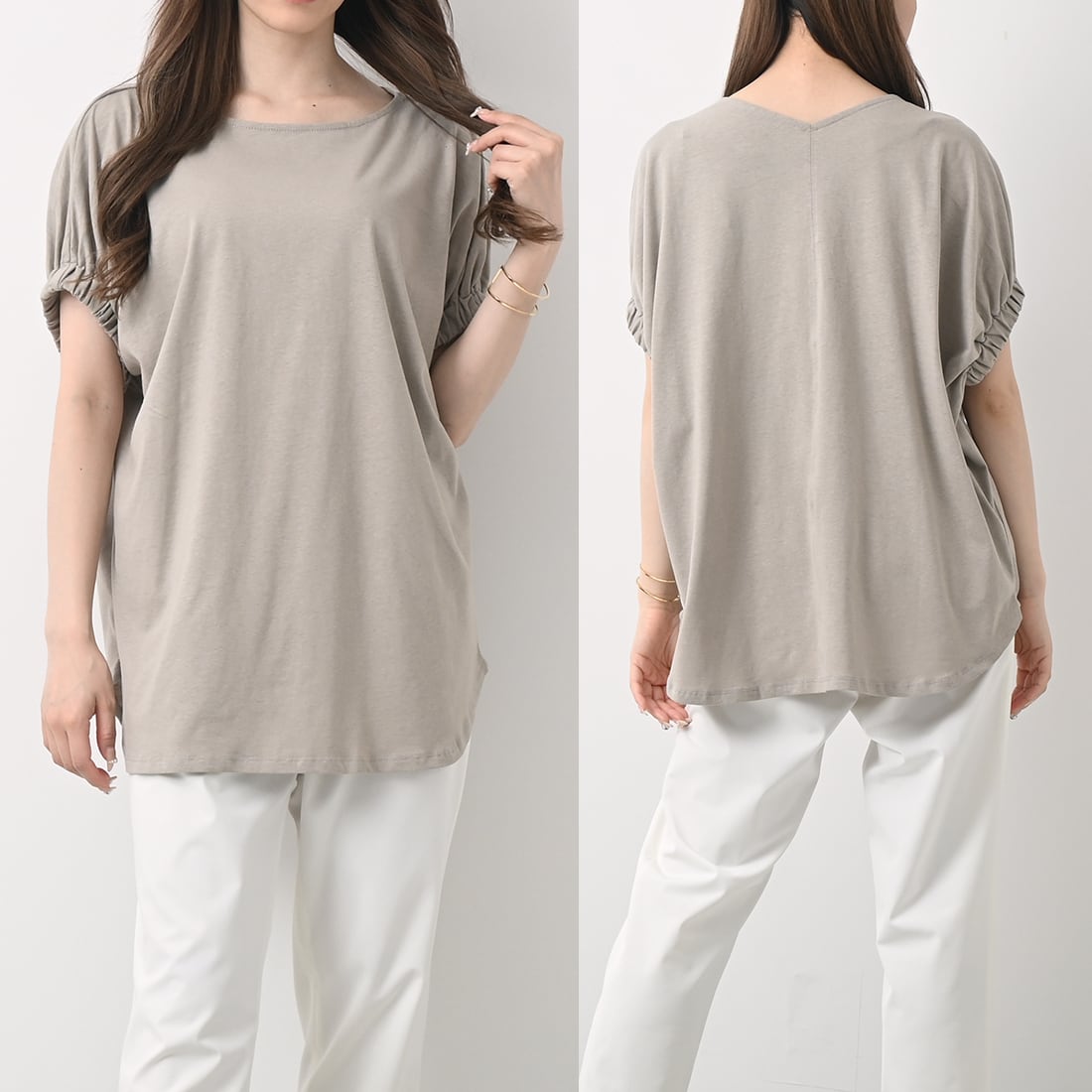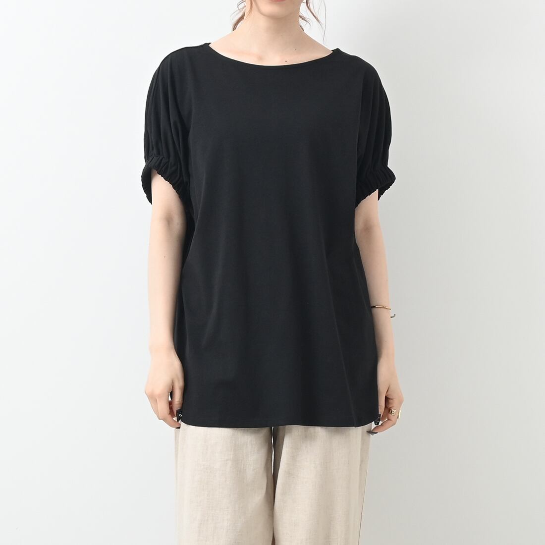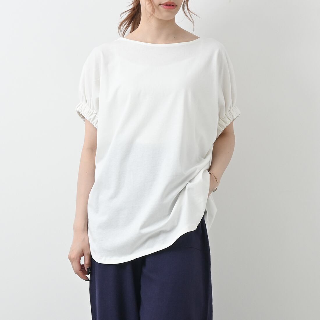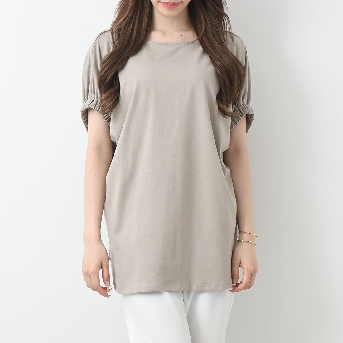 袖はゴムギャザーがアクセントになっていて、1枚でもサマになるデザイン。