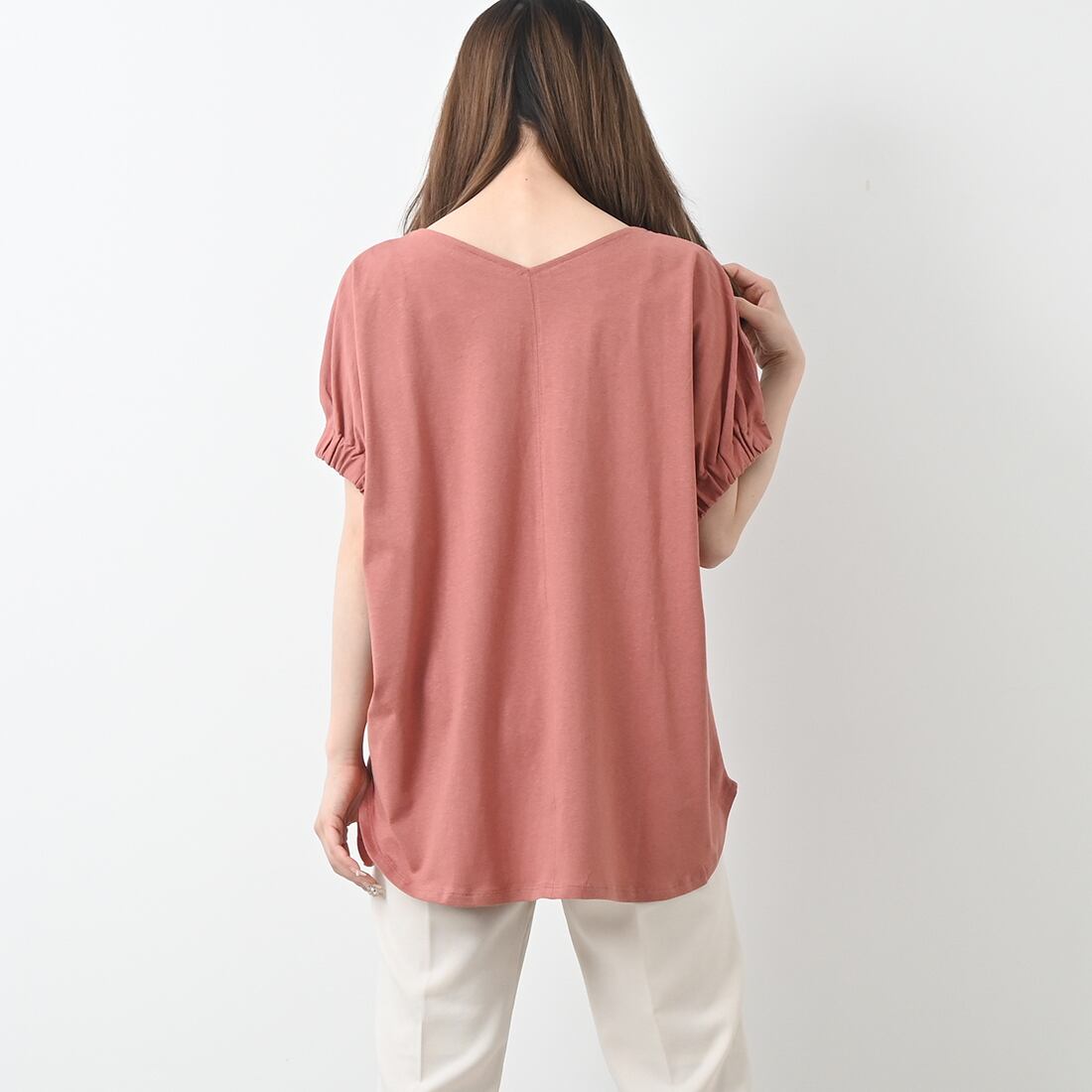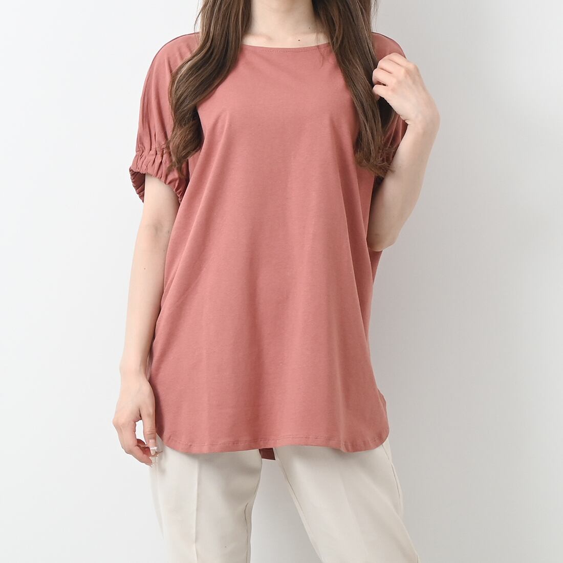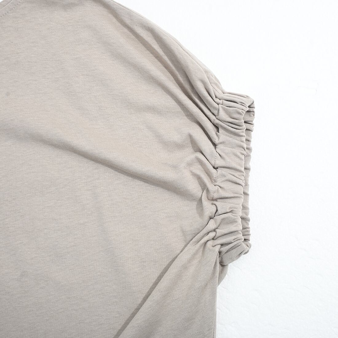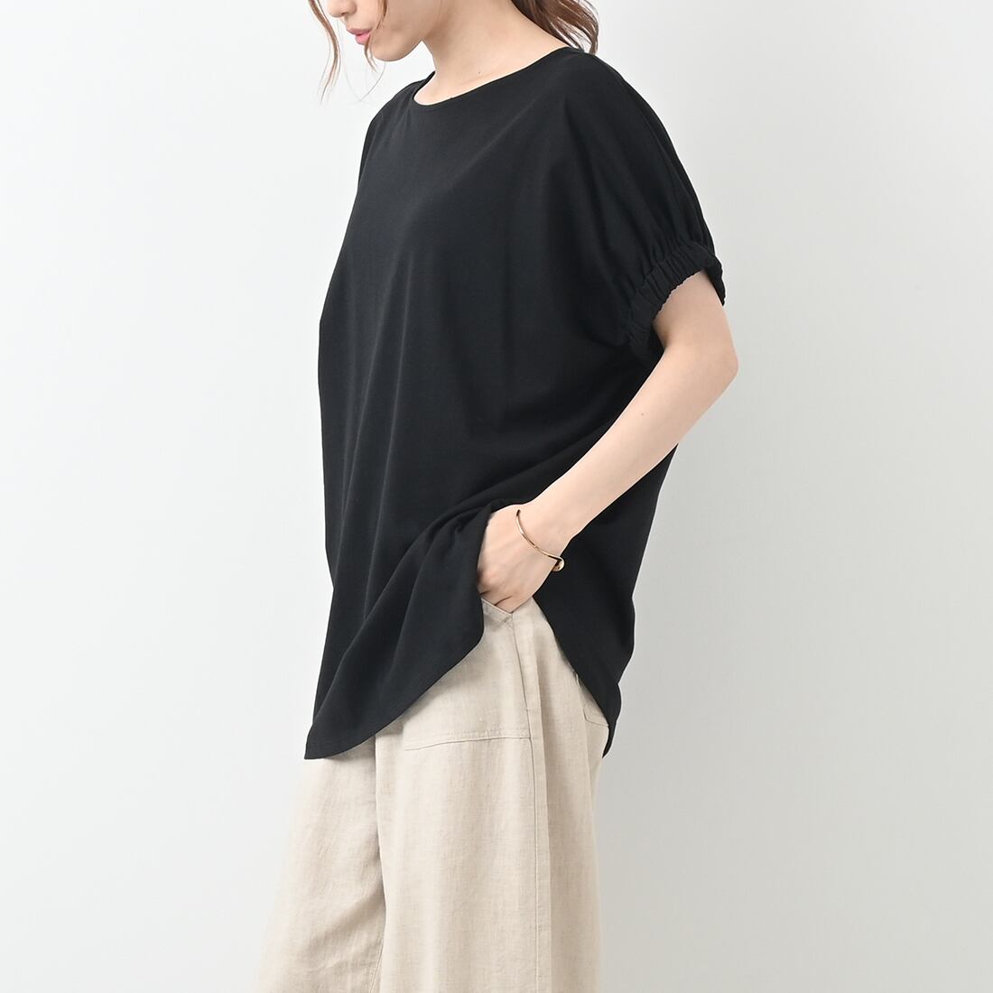 袖はゴムギャザーがアクセントになっていて、1枚でもサマになるデザイン。