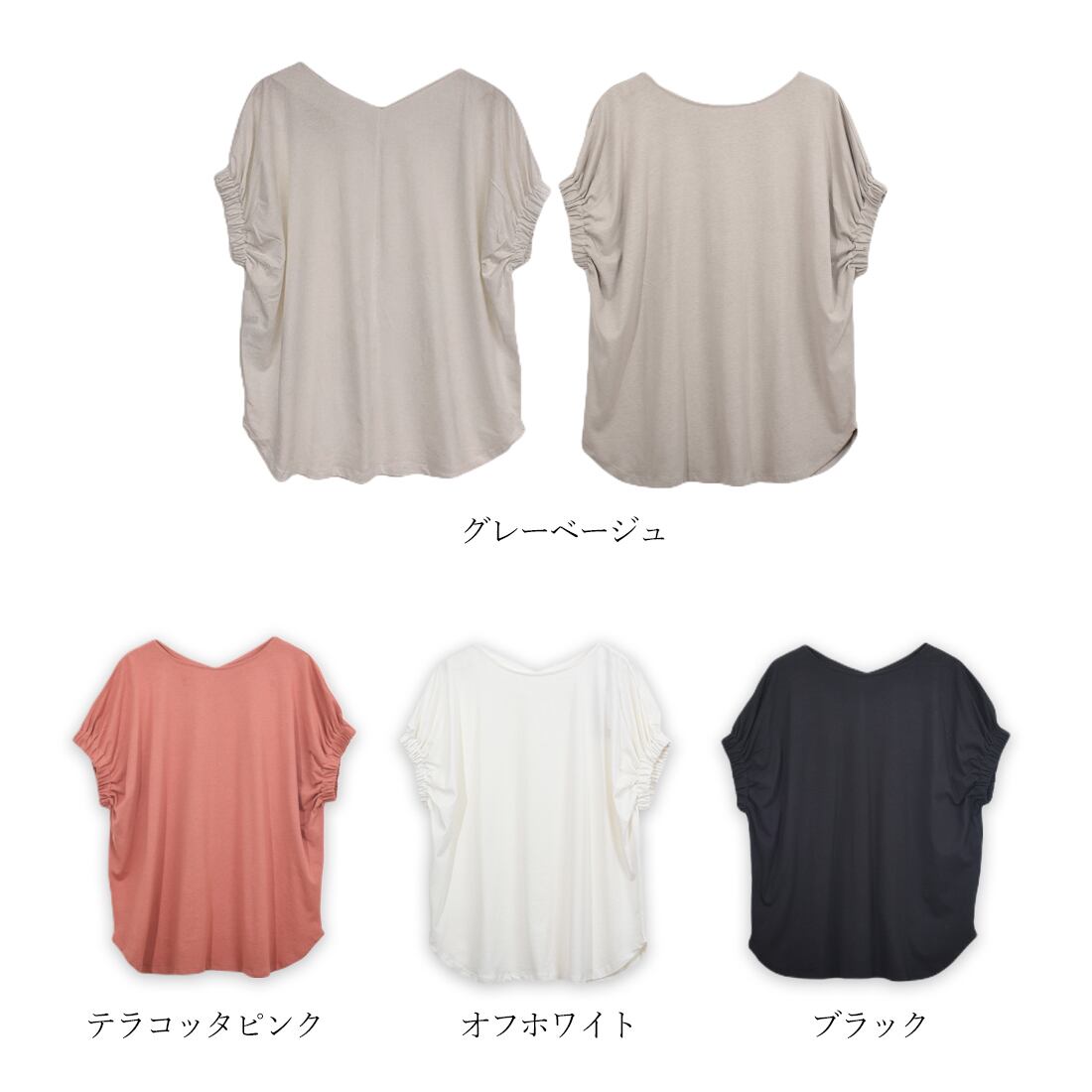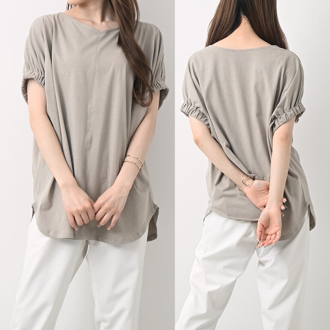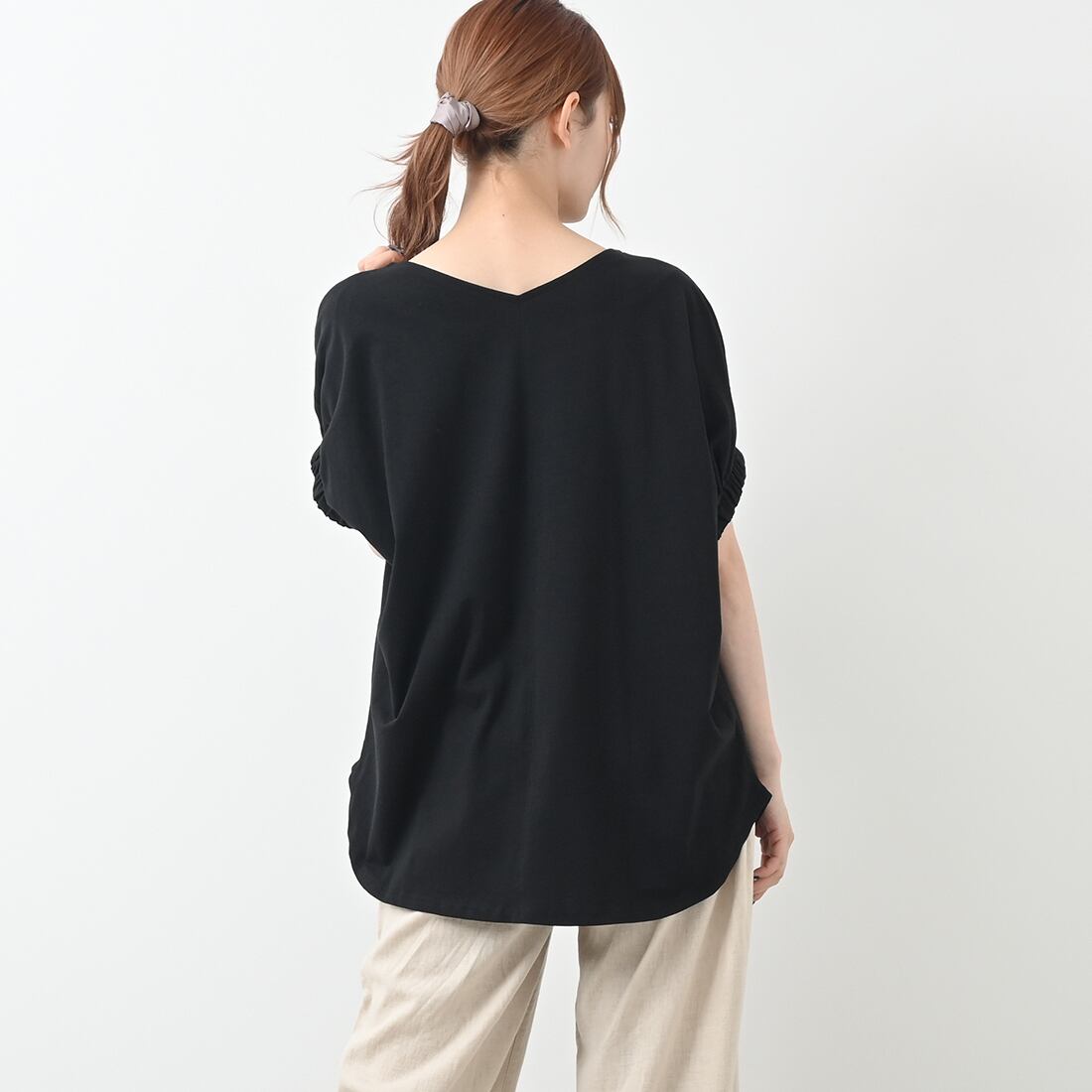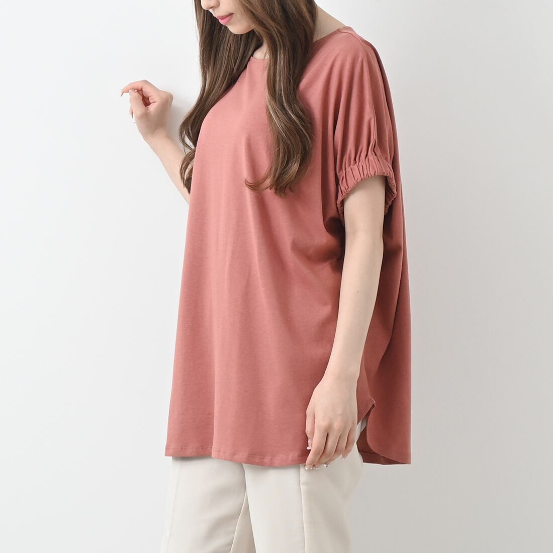 袖はゴムギャザーがアクセントになっていて、1枚でもサマになるデザイン。