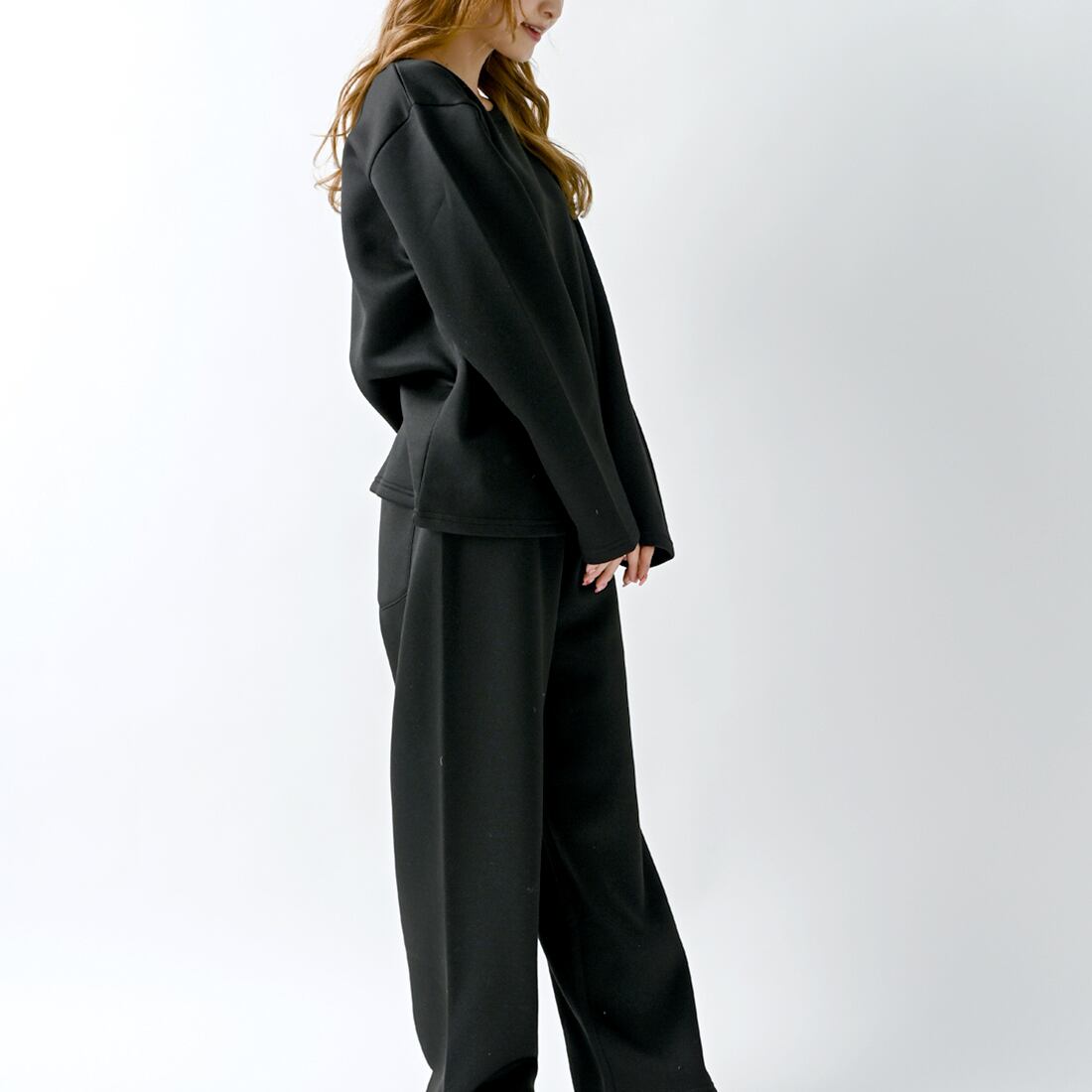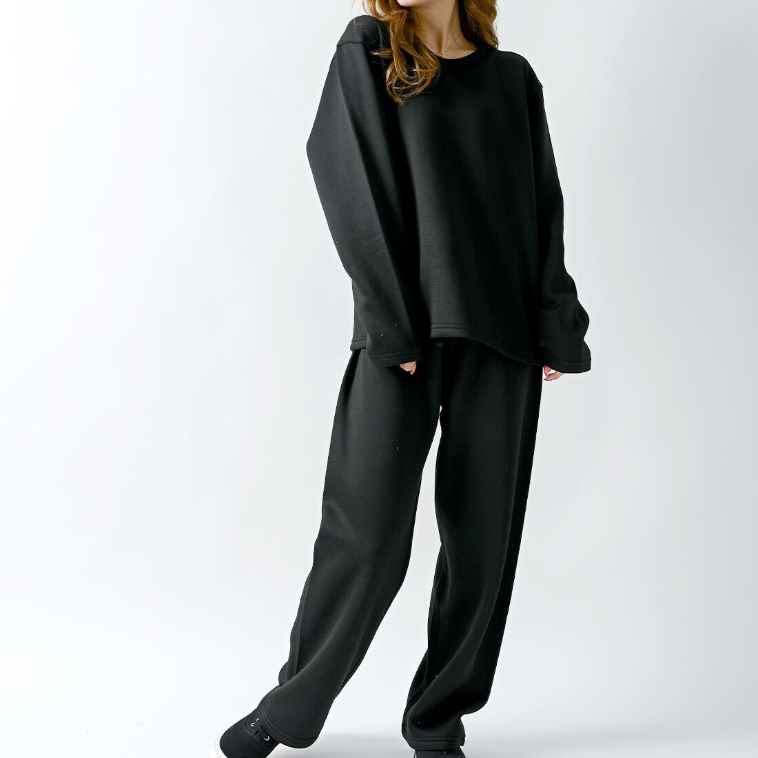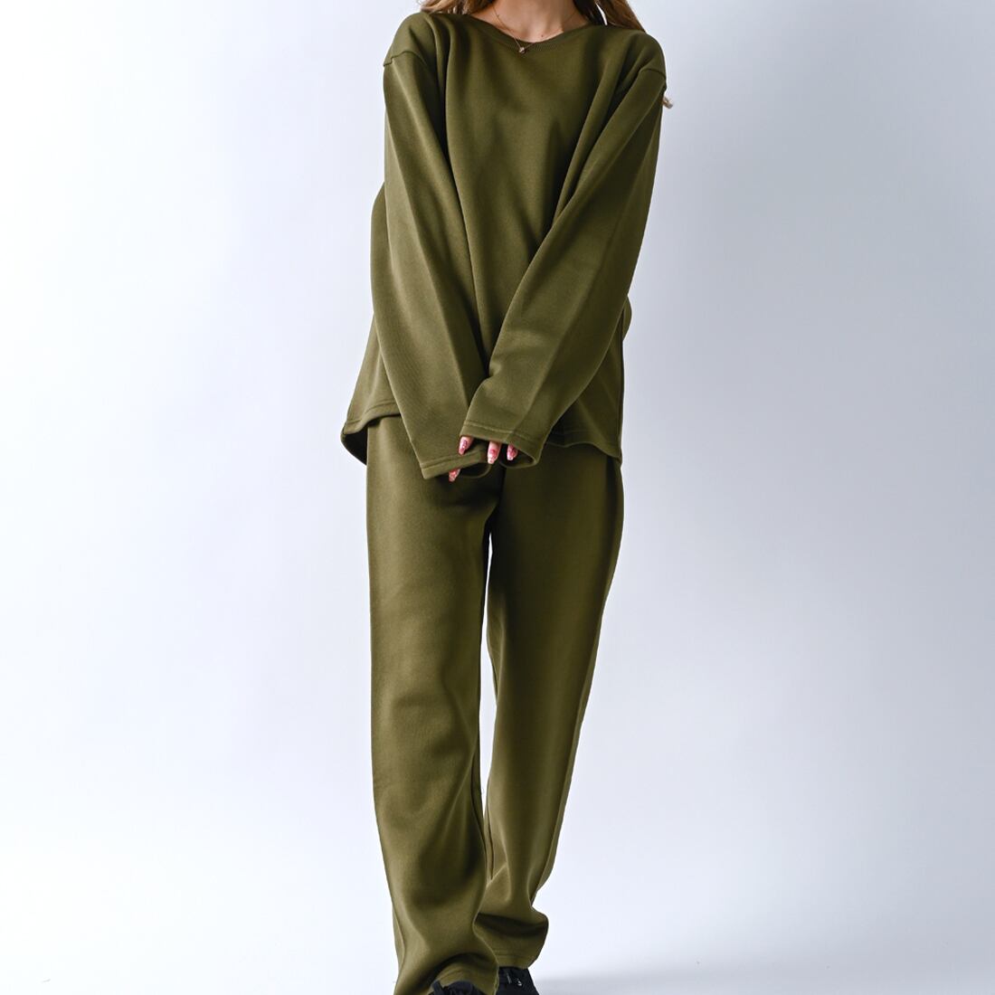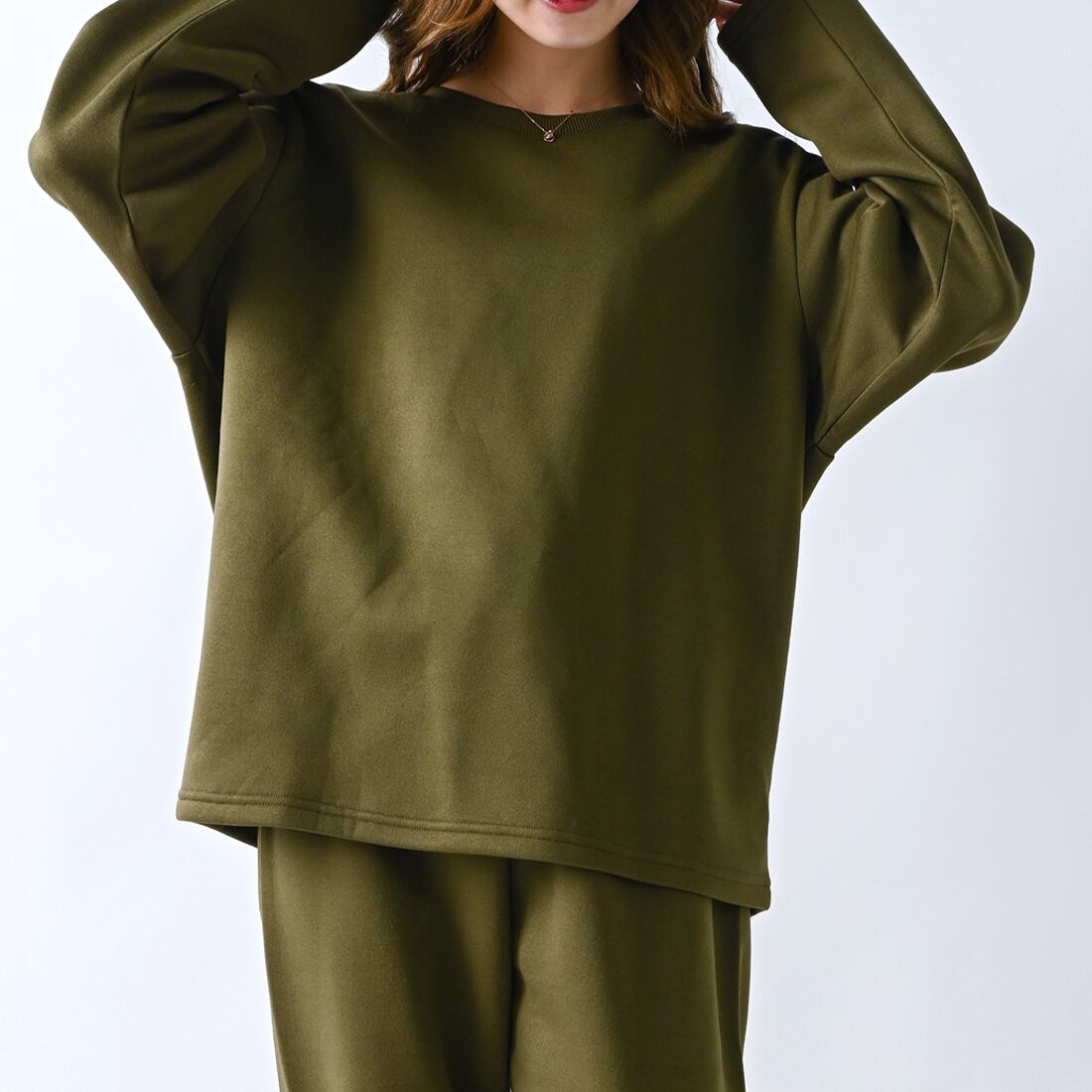落ち着いた色合いのシンプルプルオーバーとパンツの上下2点セットアップです。