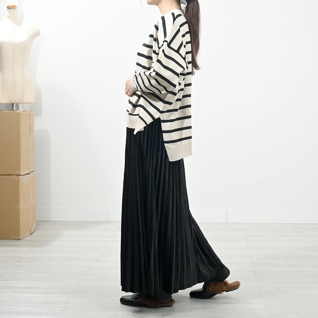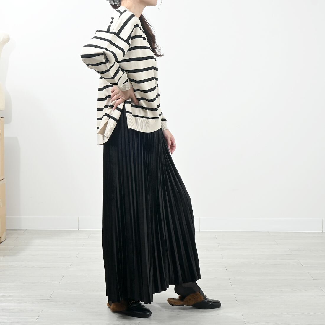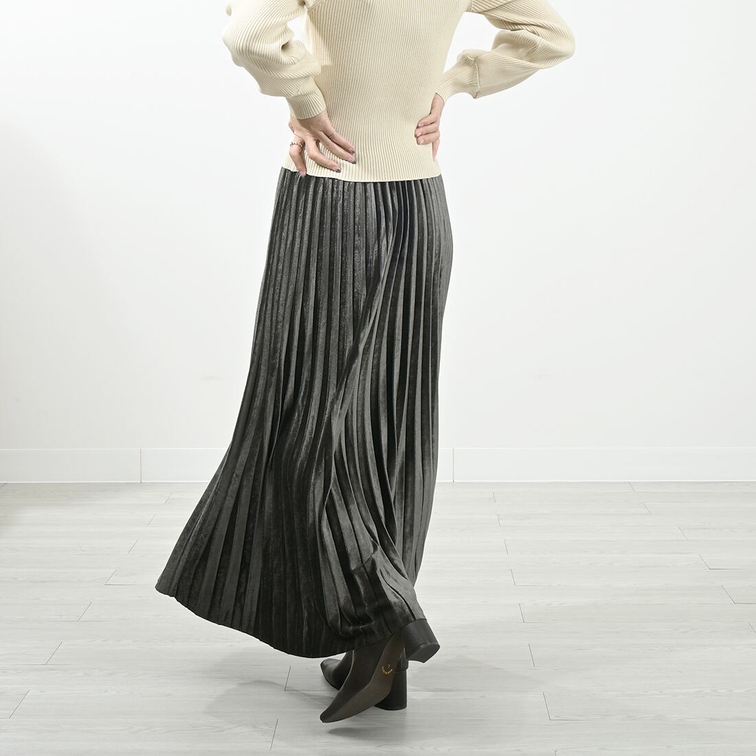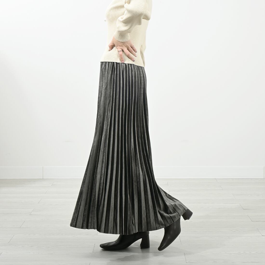 歩くたび細かなプリーツの揺らめきがエレガントなマキシロングスカート。