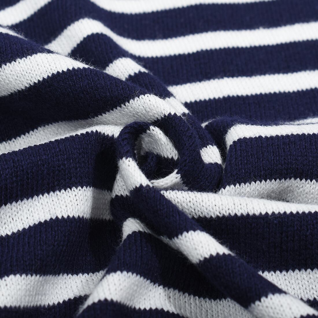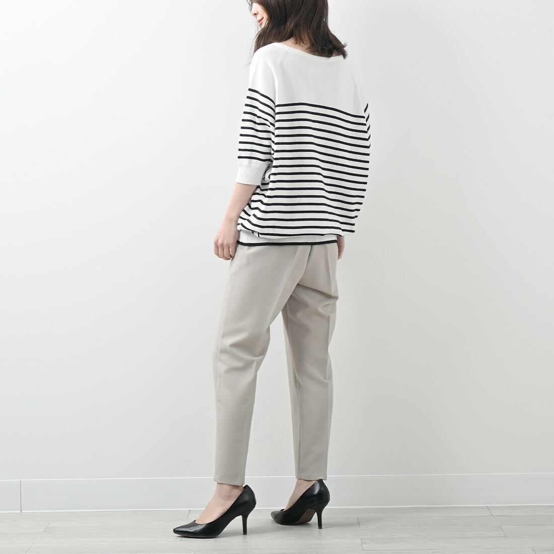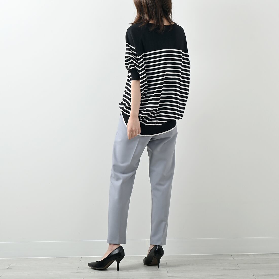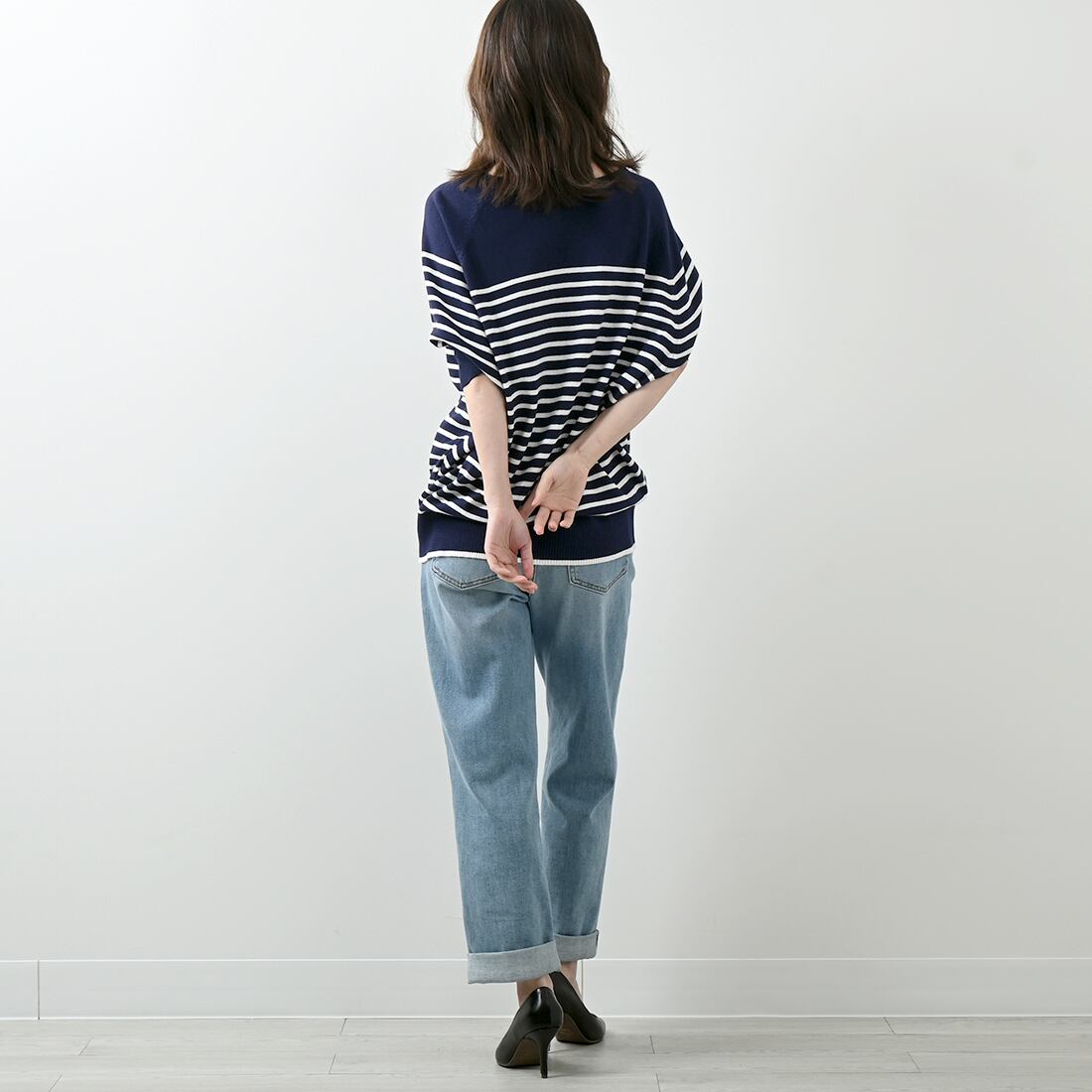 清涼感あふれる春夏のデイリースタイルにぴったりな、パネルボーダー柄の半袖ニットプルオーバー。