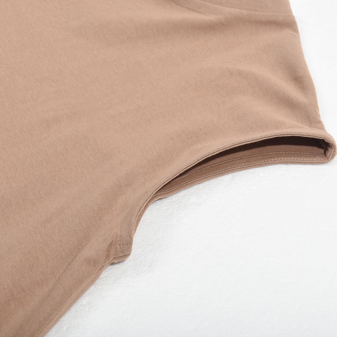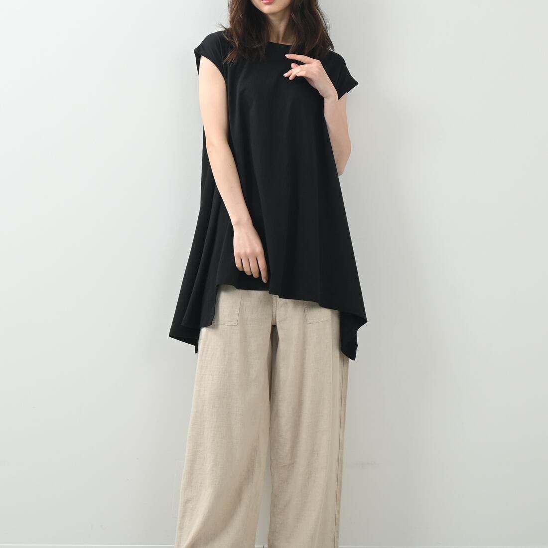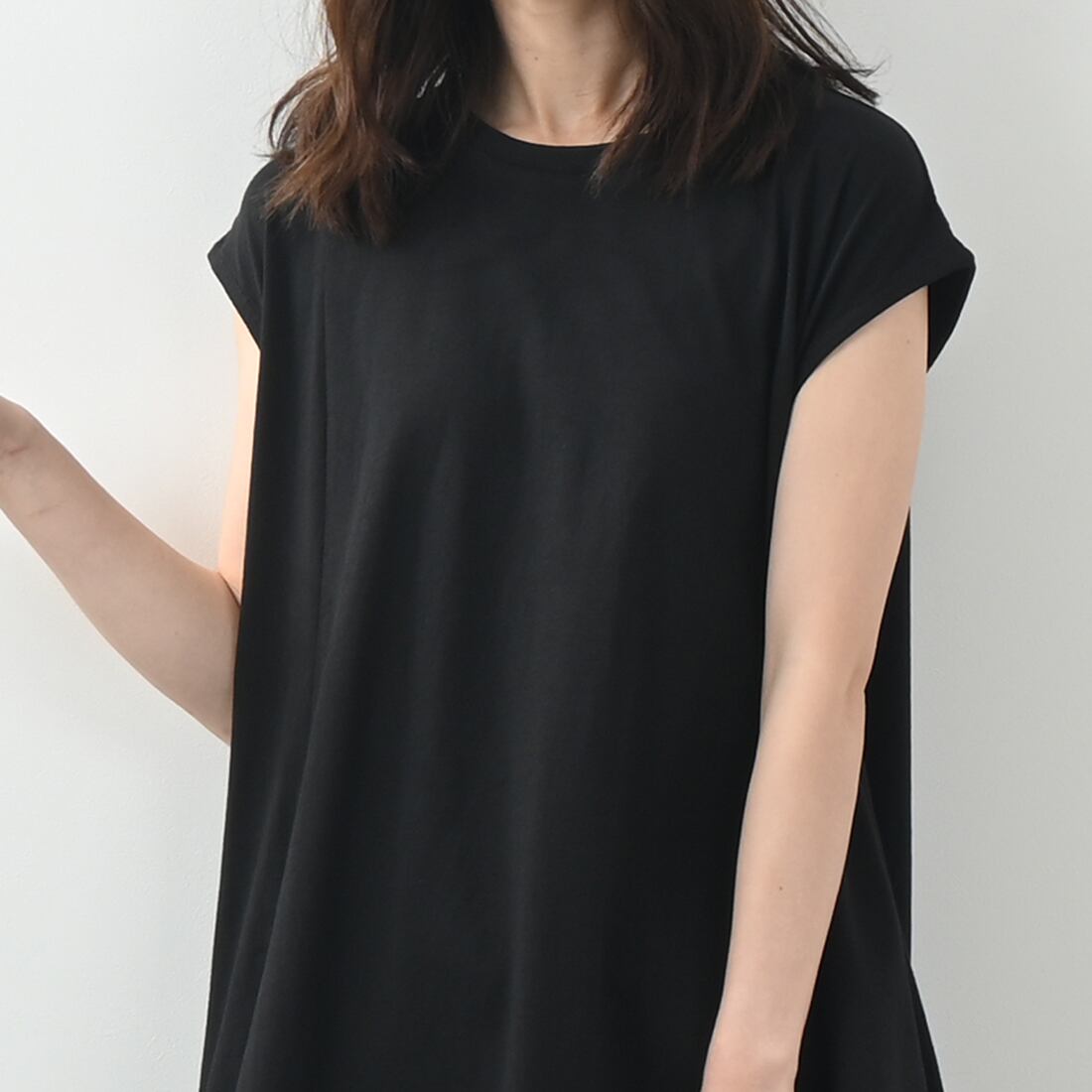 長めの丈感なのでお尻がカバー出来るのはもちろん、フレンチスリーブで二の腕の細見せ効果も◎